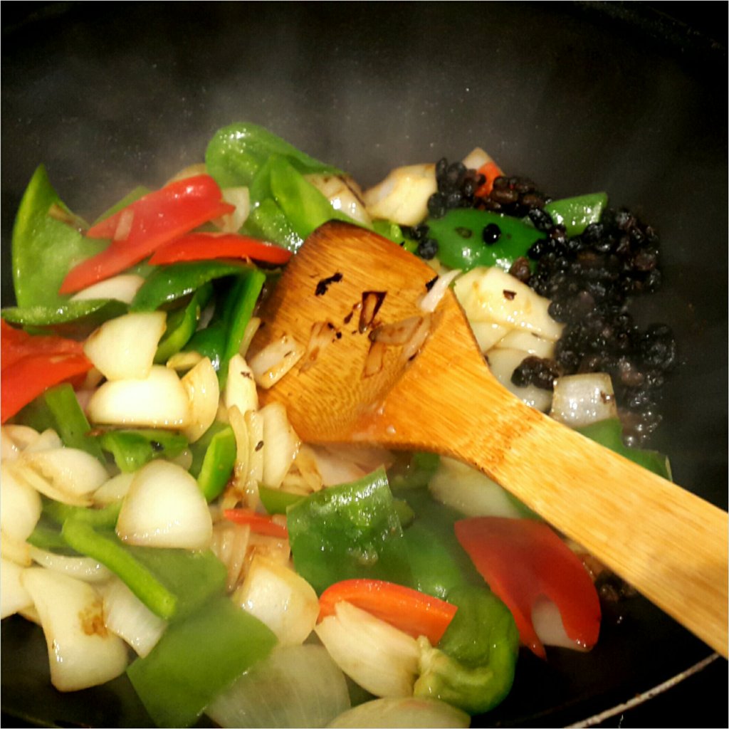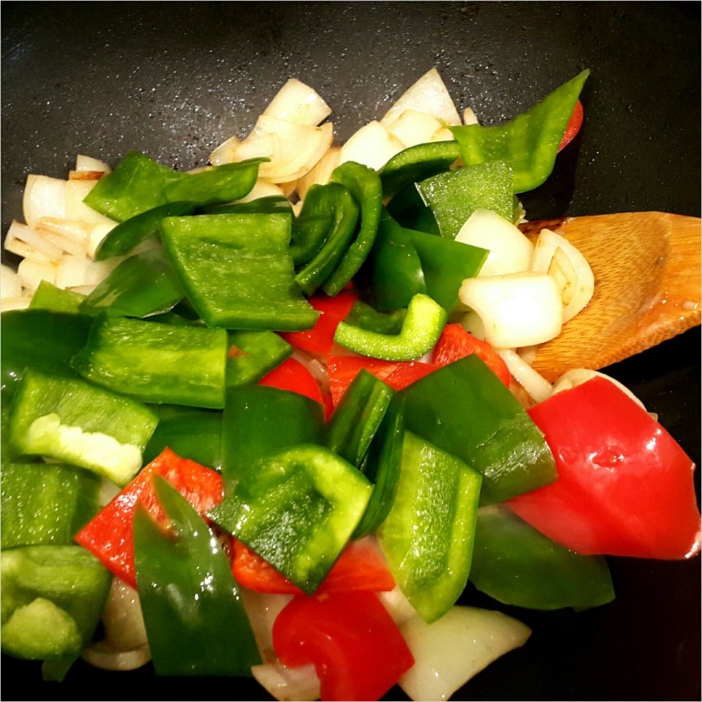 洋蔥金黃邊後,再放青紅椒,放少許鹽,少許胡椒粉,再炒一會