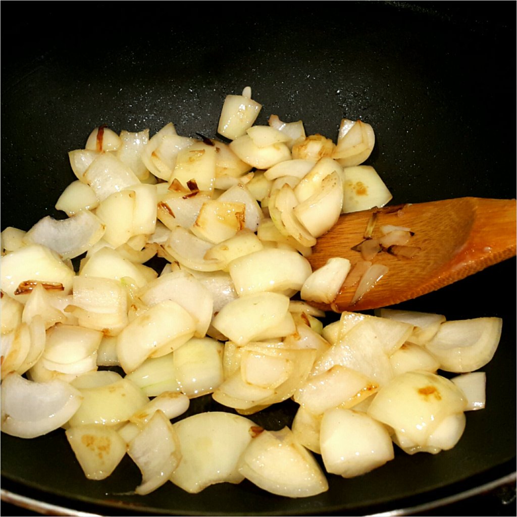 煎完牛肉記得清洗一下鑊才開始煮,先用中大火燒紅鑊,再用2湯匙生油炒洋蔥,炒一會加少許糖,炒至洋蔥金黃邊