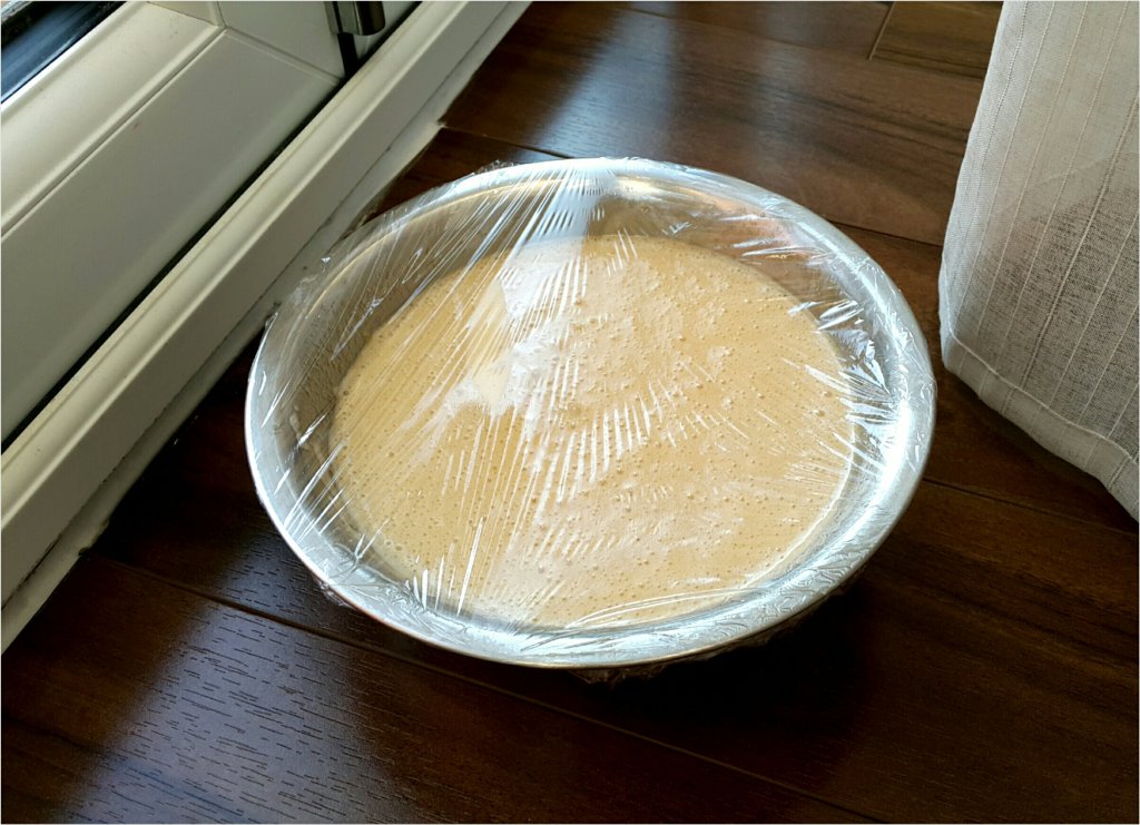 包好保鮮紙,放和暖地方發酵2小時,如果冷天,放入已預熱50度焗爐,立即關爐,放入麵糊發酵1小時