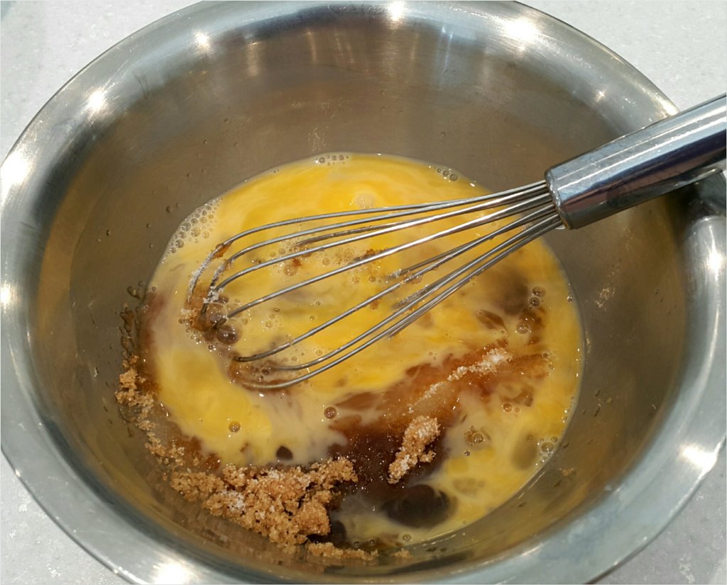 3隻雞蛋+190克黑糖先用打蛋器發打至淡黃色,稠身,再加入160克淡奶拌勻