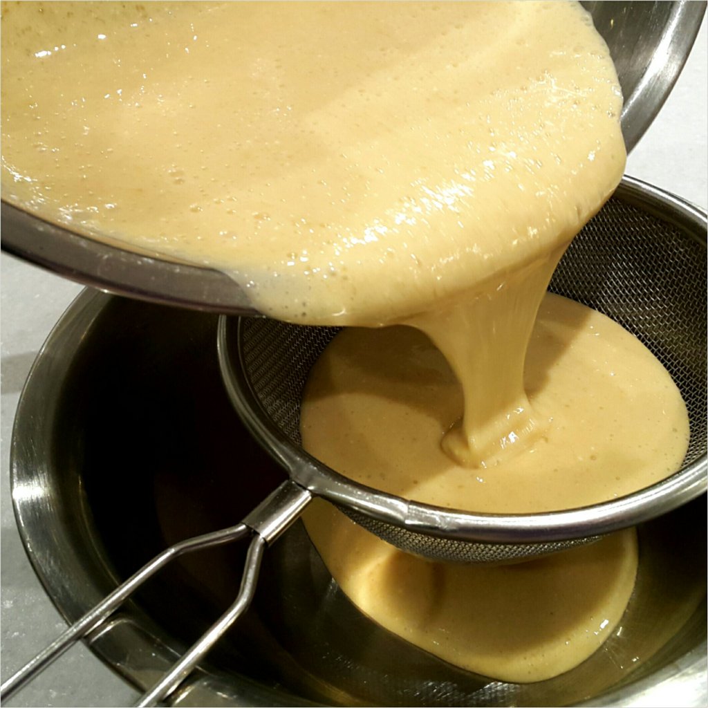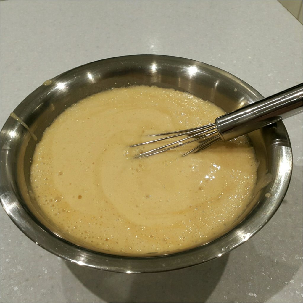 細盤拌勻後搗回大盤麵糊,用手動打蛋器拌勻