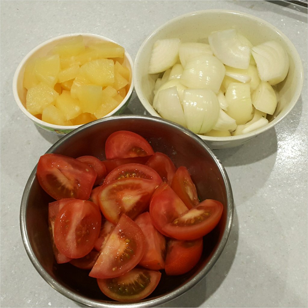 準備糖水罐頭菠蘿跟洋蔥切差不多大細,洋蔥切角,蕃茄切角備用