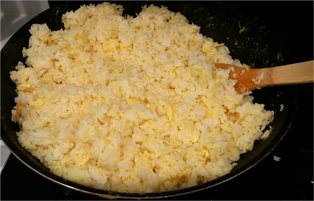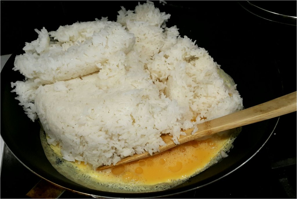 打散6隻蛋後,中大火燒紅鑊,用3湯匙油落鑊,放蛋漿,立即放白飯炒勻