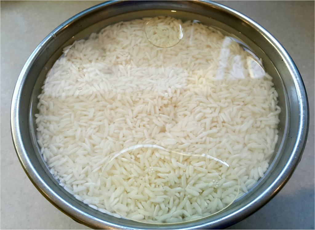 2杯半白米,水浸過面,浸至米全白色,容易碎
