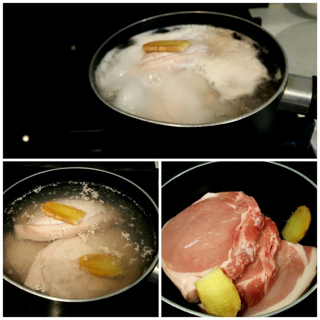 豬肉加兩片薑,放滾水過面,大滾後關火