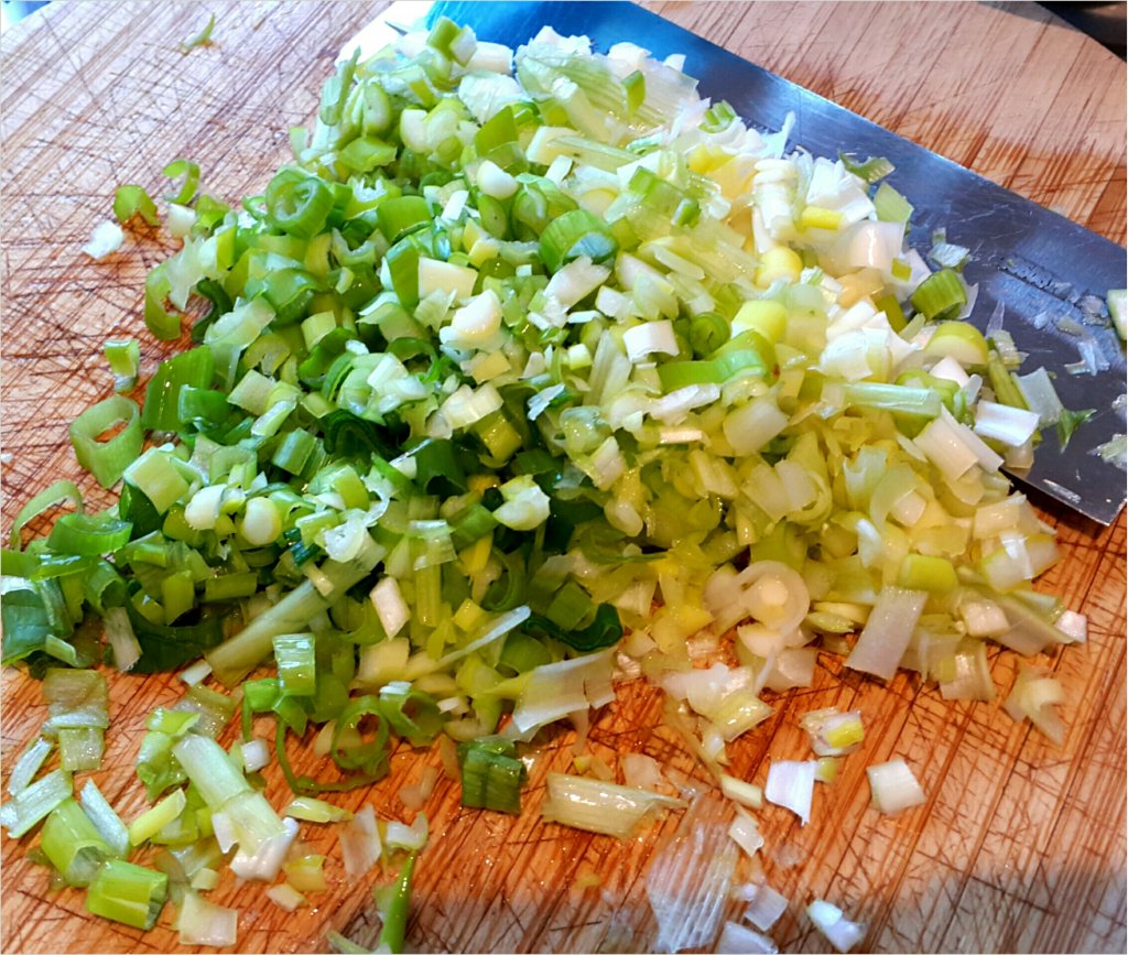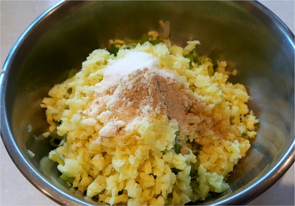 切好薑蔥後,加入1茶匙雞粉,2茶匙鹽,1茶匙胡椒粉拌勻