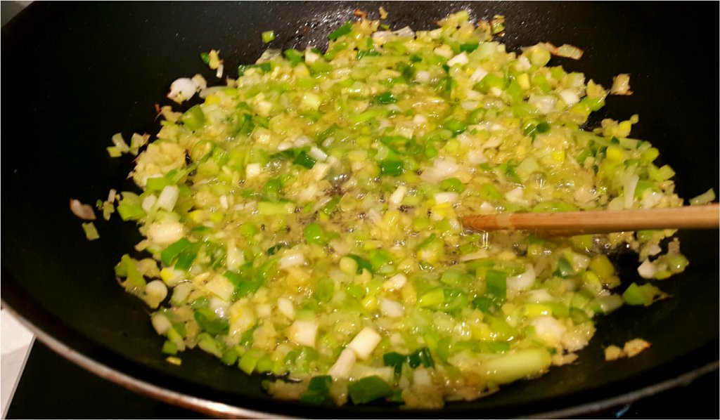 8湯匙生油煮熱薑蔥粒,有香味出,薑有金黃色邊,即是完成