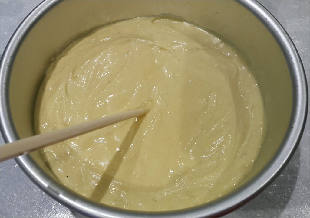 搗入7吋蛋糕盤,用快子打橫寫好多個Z,確保中間無氣泡