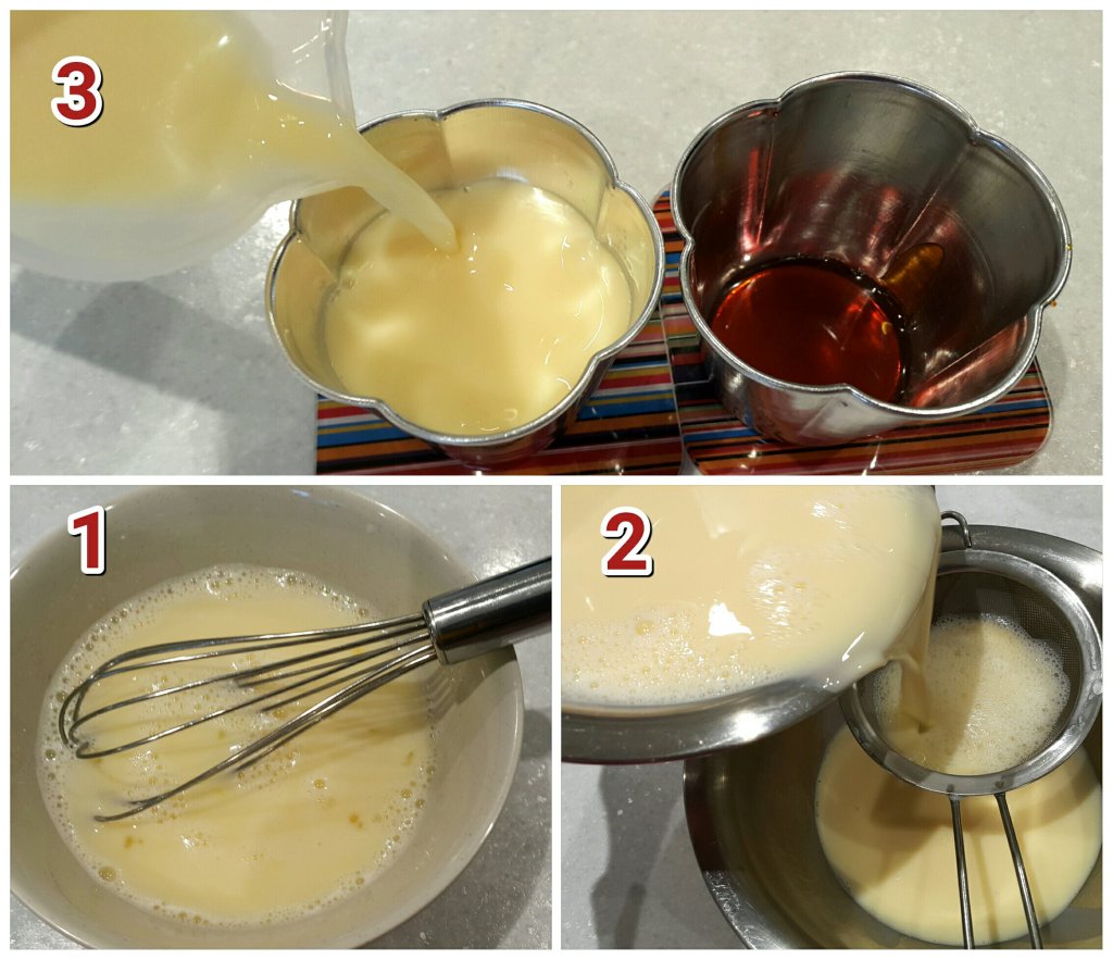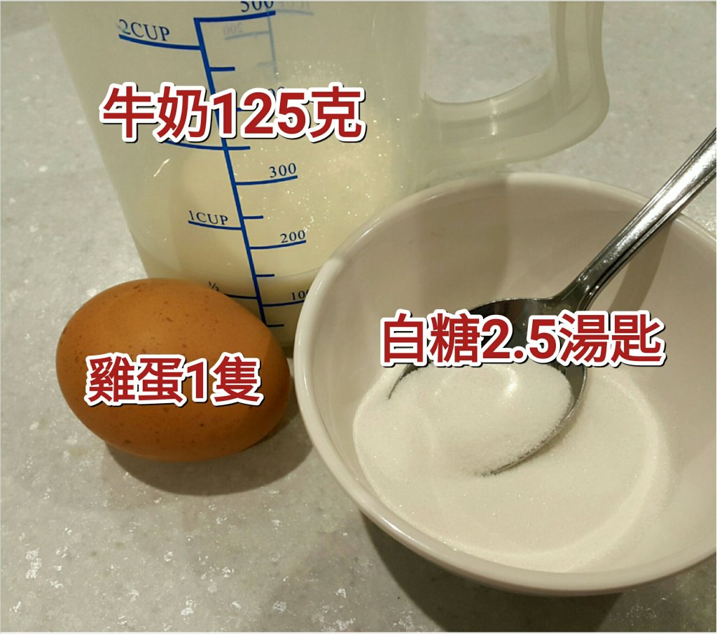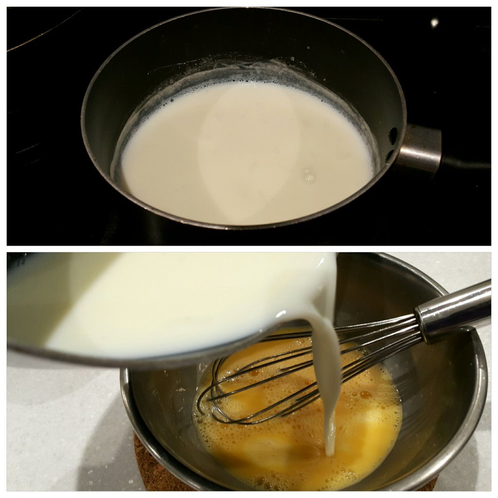 用細火煲滾奶125克和糖2.5湯匙至完全溶解, 離火加入已打散2隻雞蛋的盤子