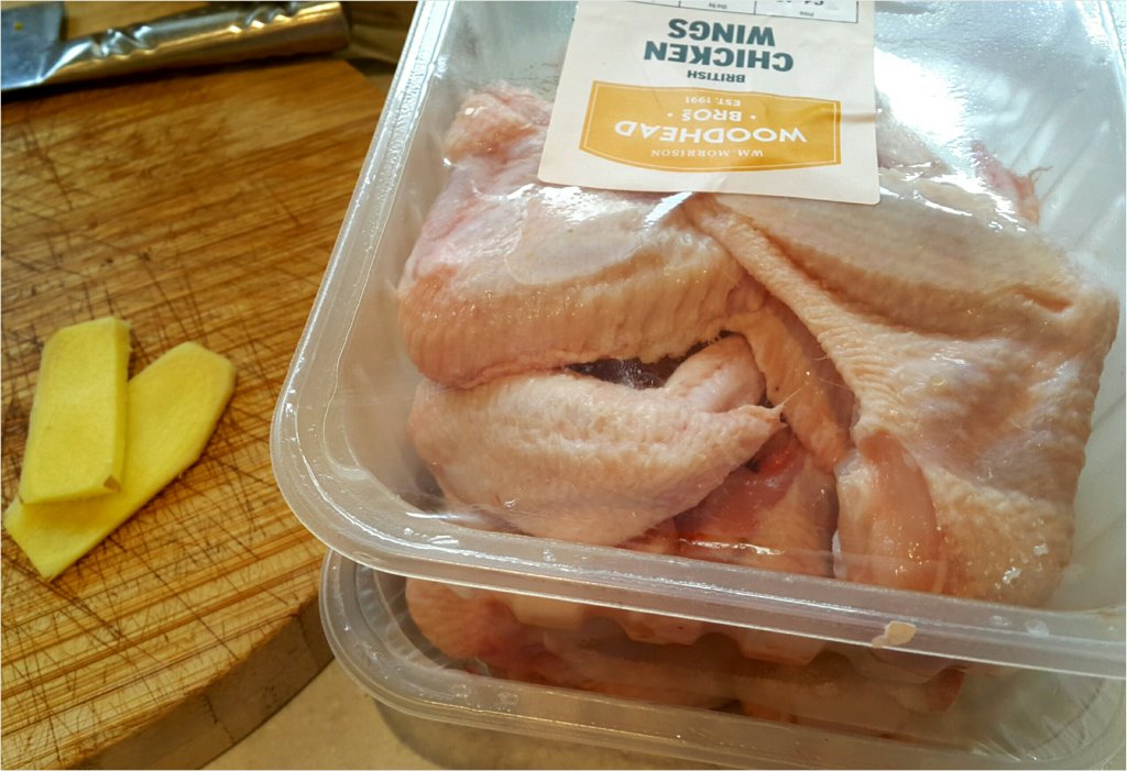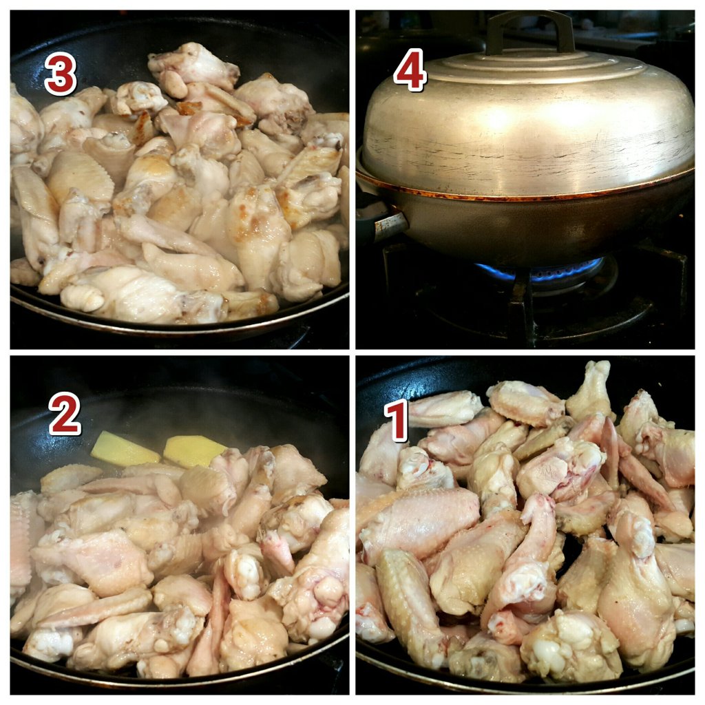 - 雞翼乾水後,加入兩塊薑片,紹興酒1茶匙拌勻