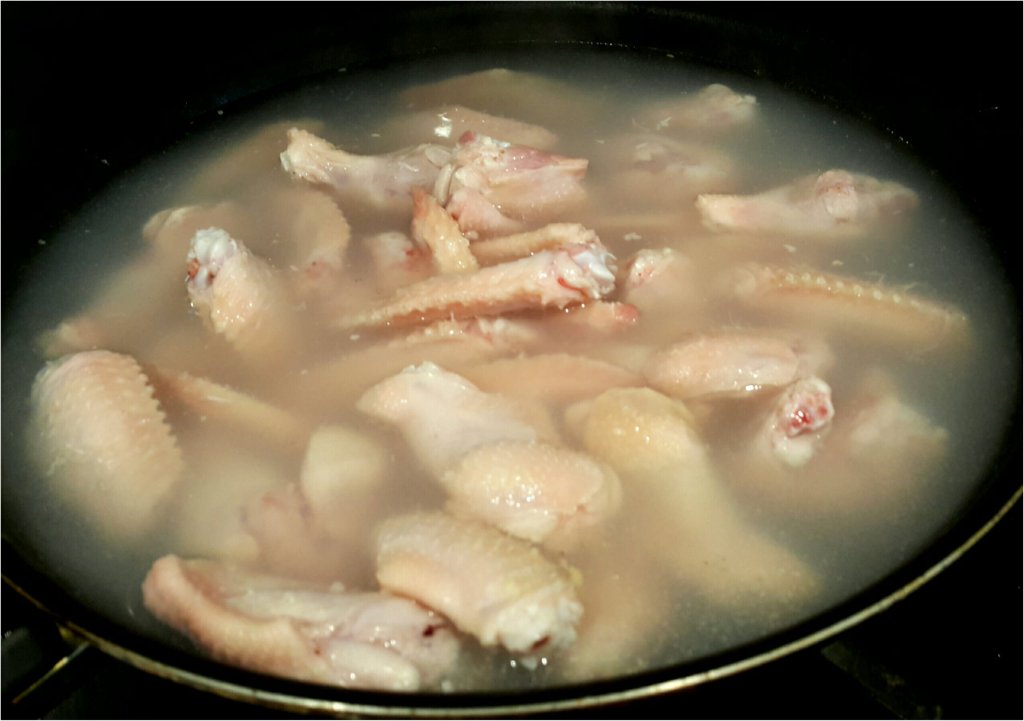 大火滾起熱水,加入雞翼大約30秒,去血水和腥味(不用滾起) , 隔水備用