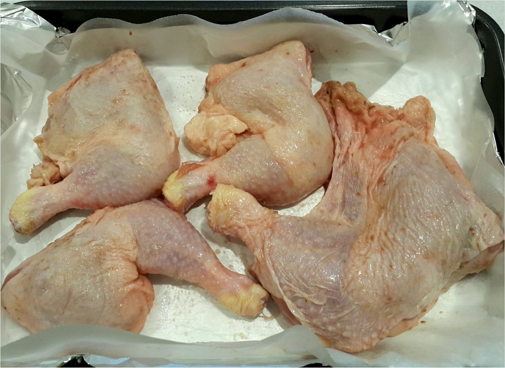 預熱焗爐200度,雞肶預早半小時拿出枱面回溫,再放入焗盤,表皮向上,會更脆