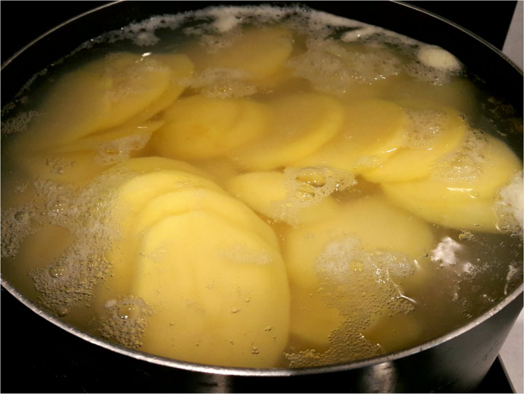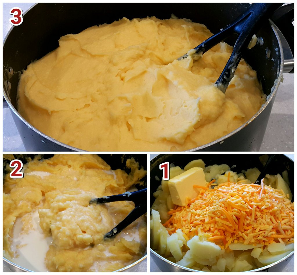 - 隔清熱水後,加入一包芝士及牛油50克,用壓薯蓉器壓至薯仔片變蓉