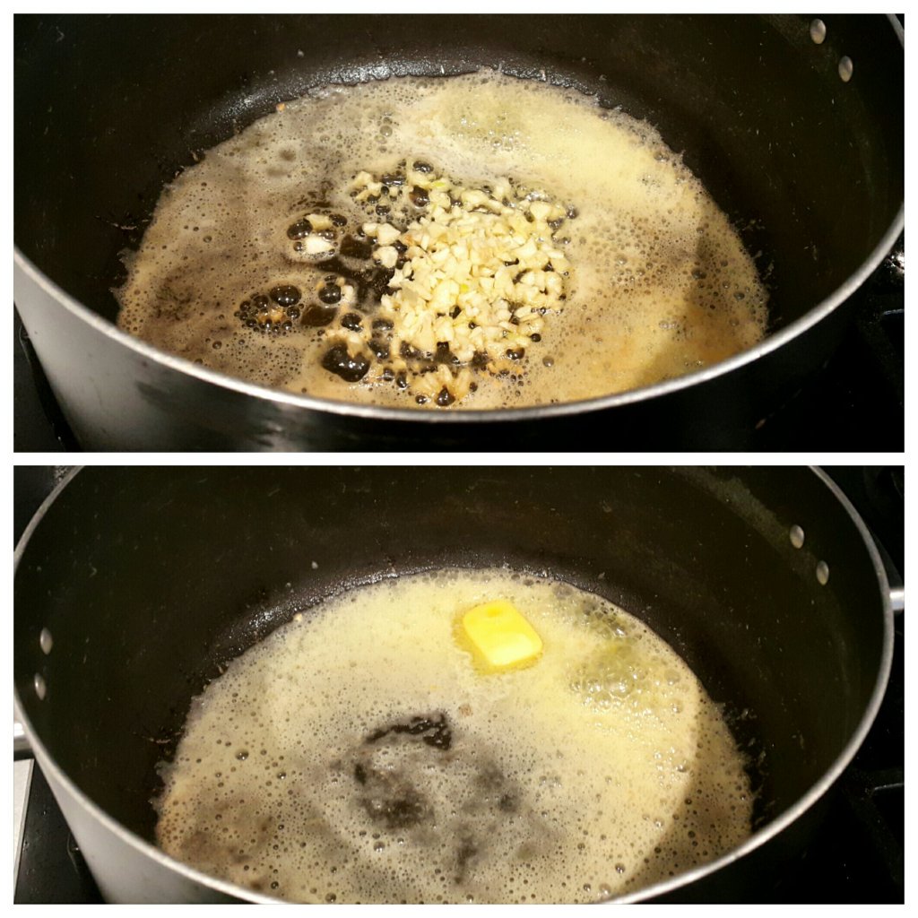中大火燒熱湯煲,放50克牛油,牛油溶化後,放2粒蒜蓉,煎至香味出,保持中大火