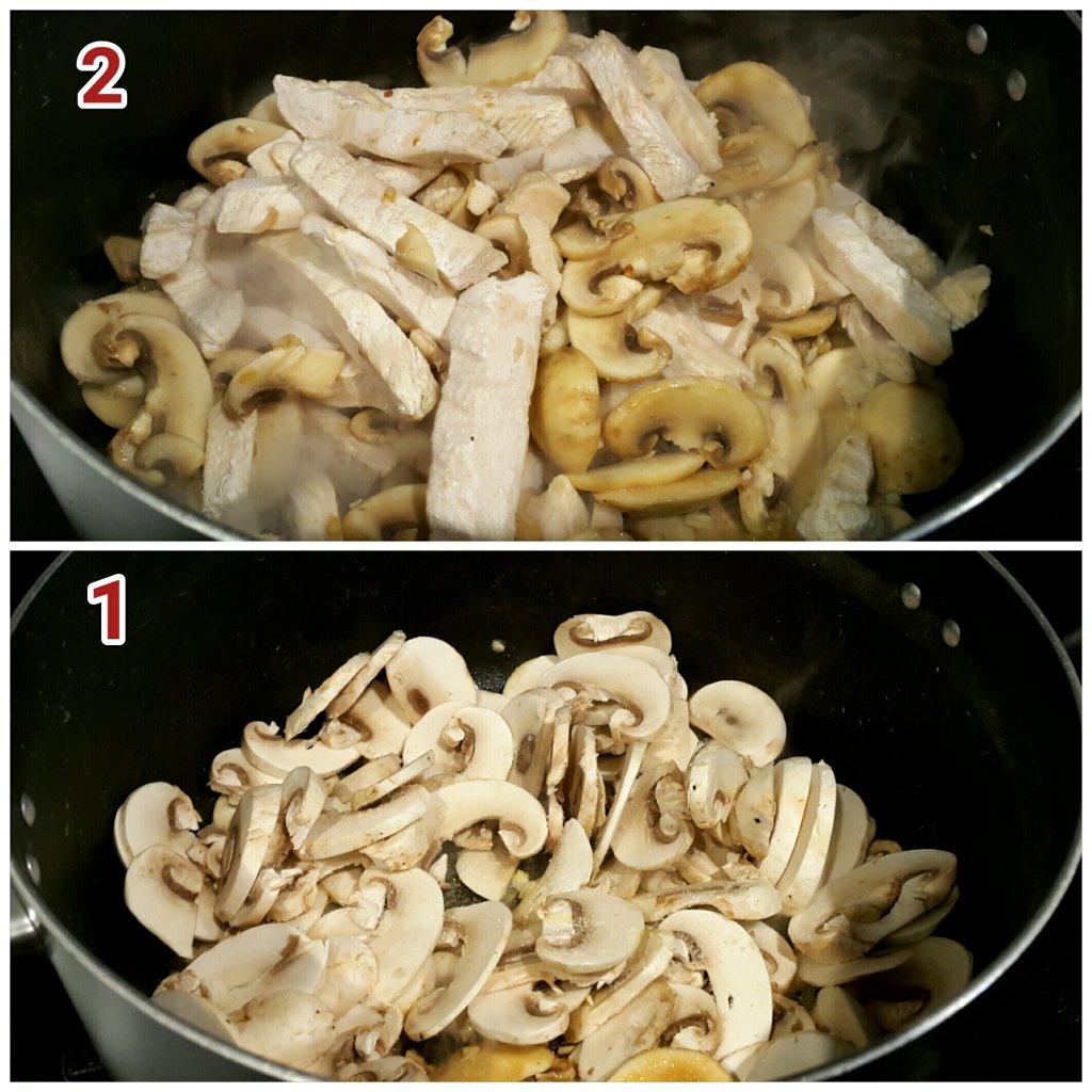 - 蒜蓉有香味出後,加入蘑菇片拌勻,灑少許白胡椒粉,鹽少許,炒至金黃邊