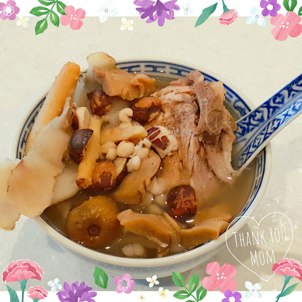 - 肉放大湯煲,加入已浸軟材料,加入3公升水,煲2小時,加鹽2茶匙,完成