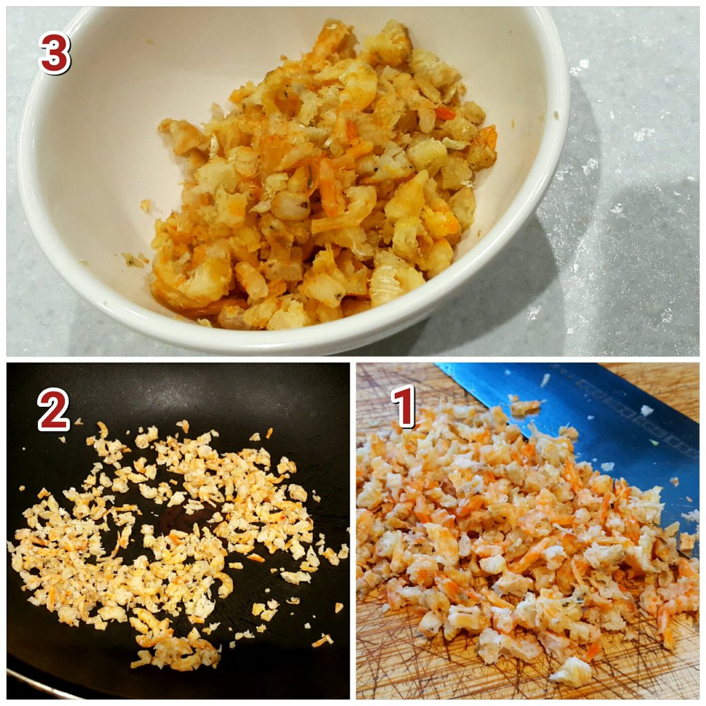 - 白鑊(無加油)中大火燒熱鑊,加入已切碎蝦米,炒至乾身