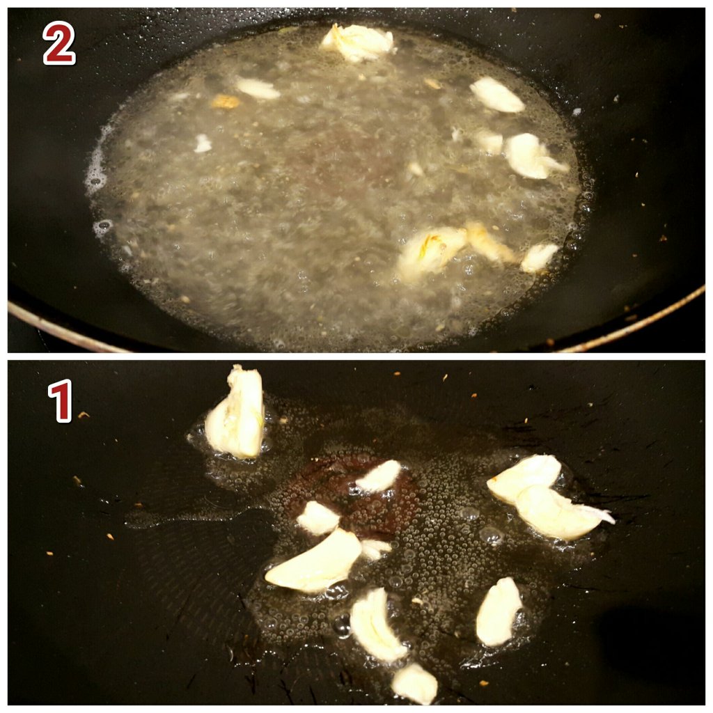 - 中大火燒熱鑊後,加入2湯匙油,加入已拍扁蒜頭2粒