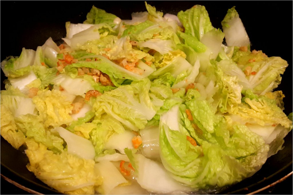 - 保持中大火,加入已橫切的大白菜,放蝦米在菜面,蓋住等大約5分鐘
