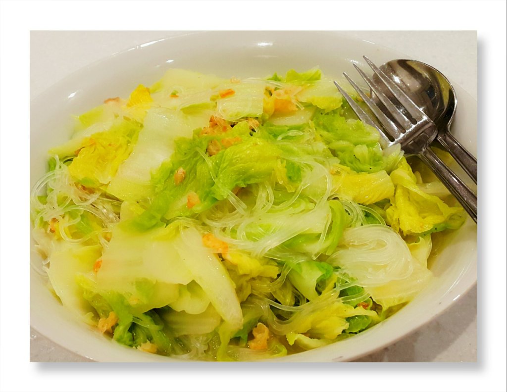 - 開蓋,加入粉絲,用菜遮住粉絲,盡量放粉絲在最底,已調味的水浸住,蓋住,轉中細火炆大約5至8分鐘,粉絲熟透便完成