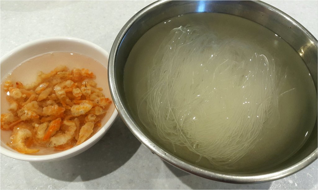 蝦米和粉絲先用清水浸15至30分鐘,大白菜洗淨後橫切備用