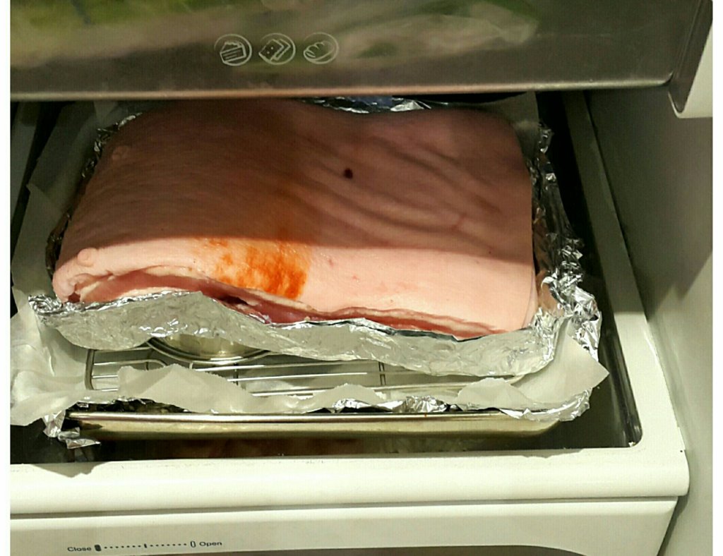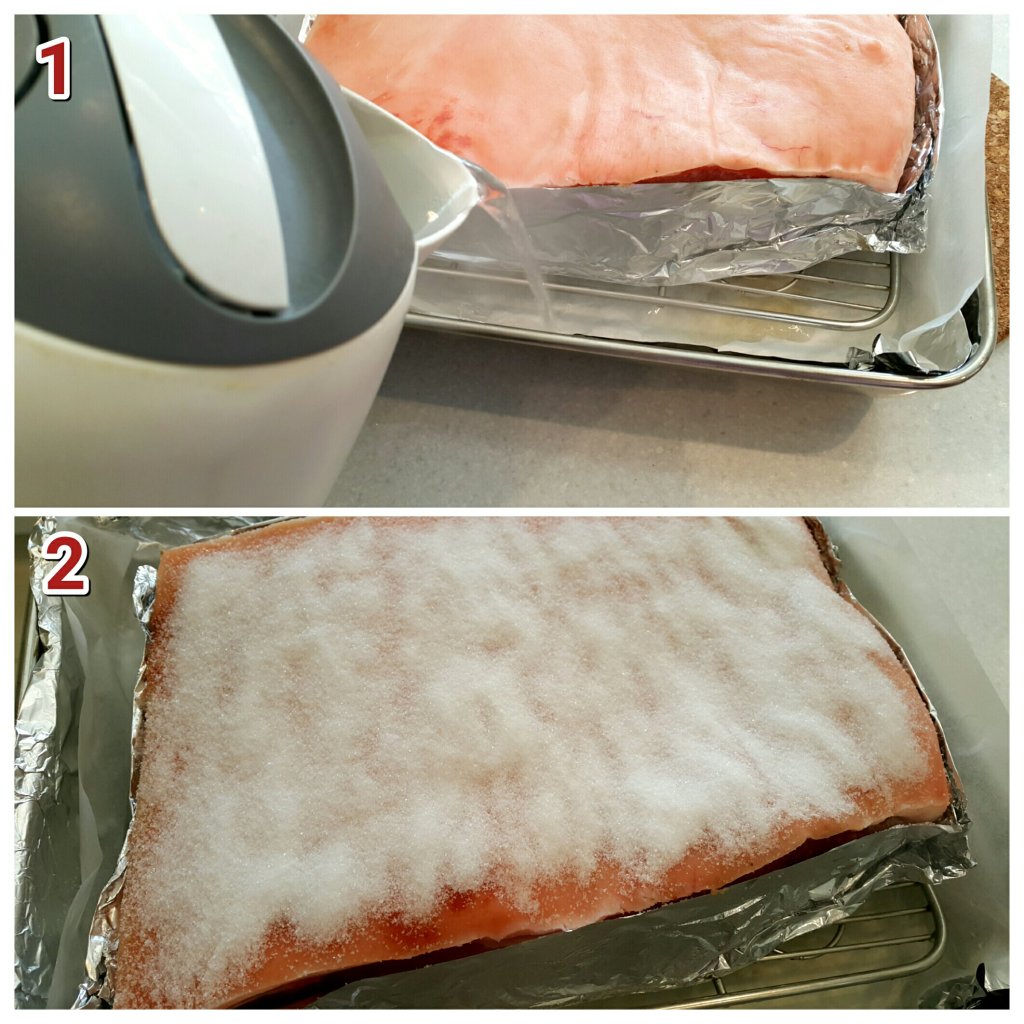 - 早半小時雪櫃拿出,室溫朒肉,用鹽鋪滿皮面
