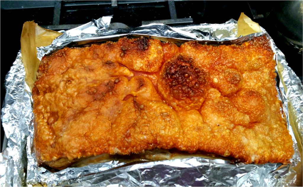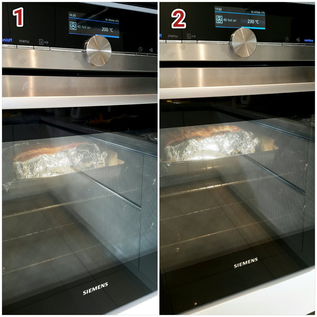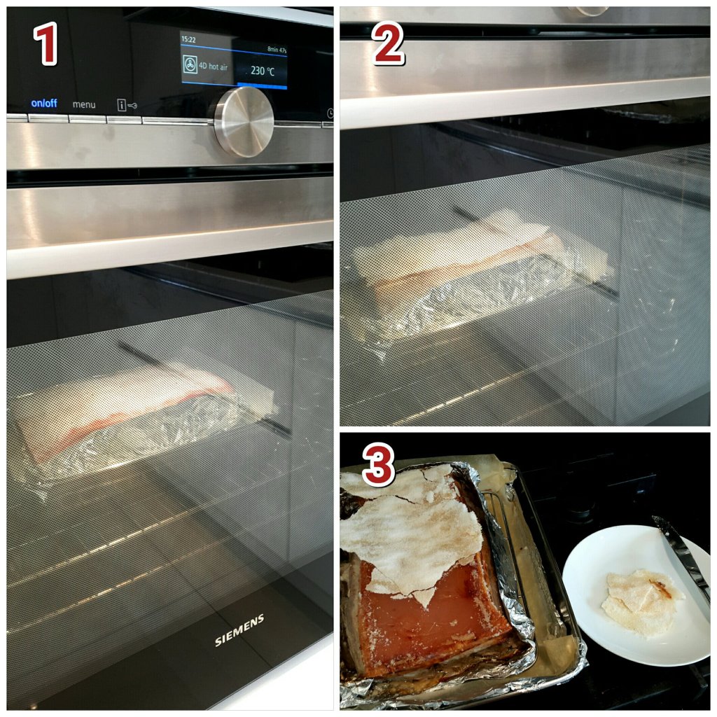 如果買到靚新鮮朒肉,夠乾身,不用焗至燶再刮去黑皮,可以230度焗10分鐘後轉200度焗40分鐘,再拿開表面塊鹽,焗爐放高一格繼續200度焗多40分鐘,最後230度焗10至15分鐘,顏色夠金黃色便完成