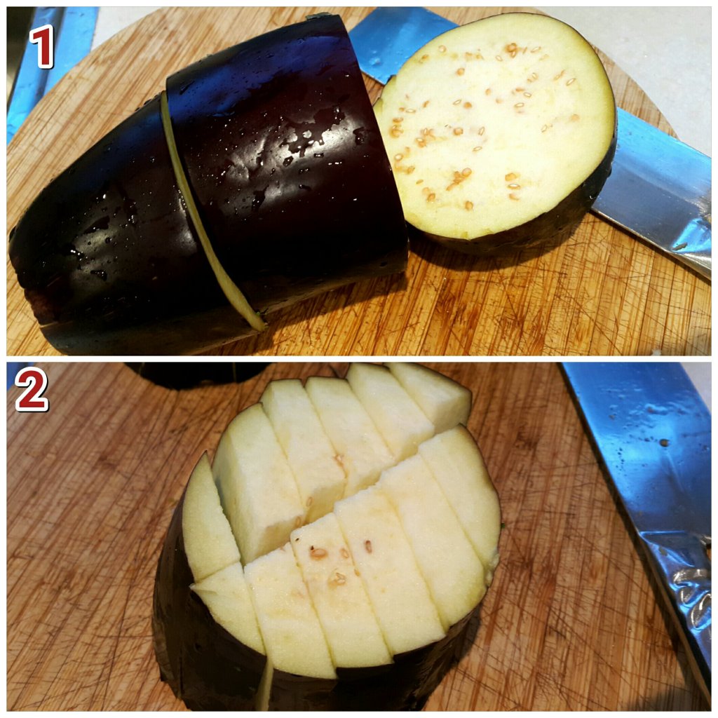 - 然後中間直切一刀,再橫切5刀(視乎茄瓜粗幼而定),成片狀