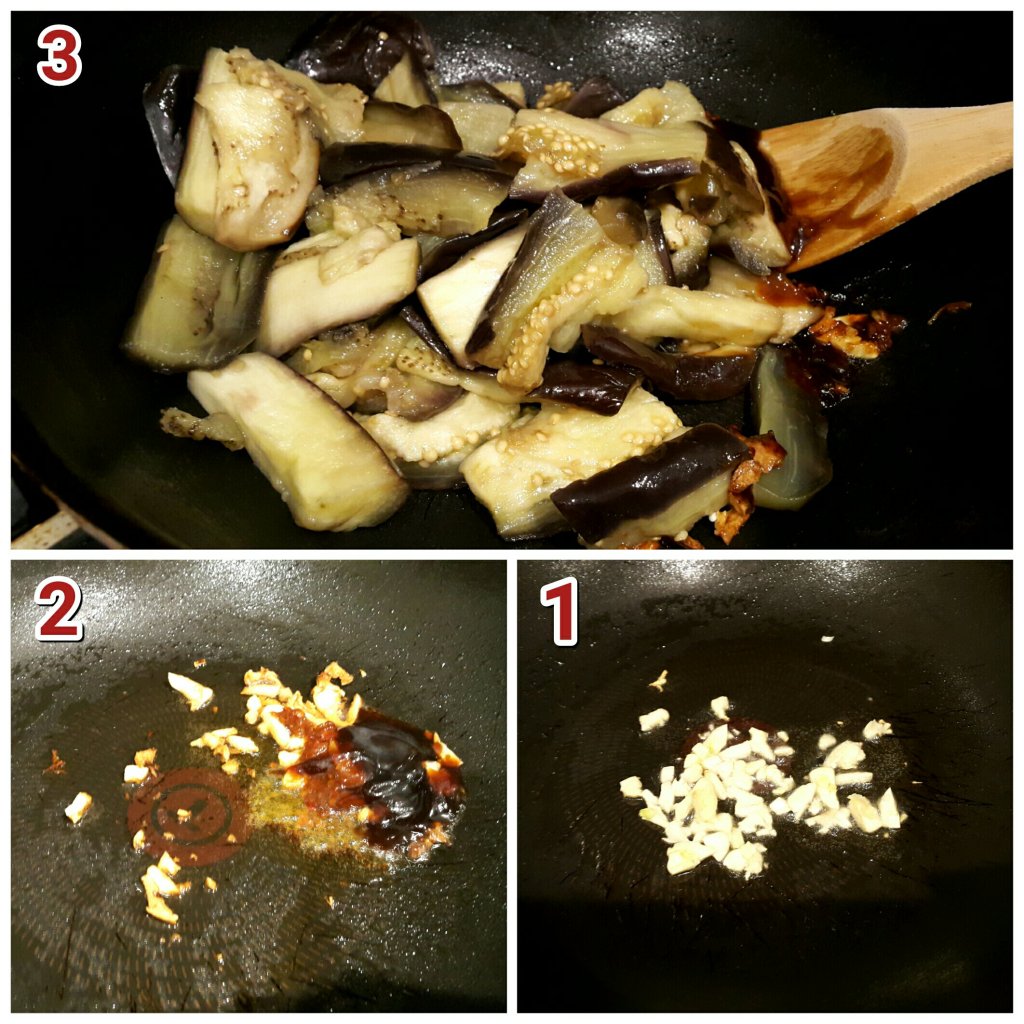 - 加入已煮過茄子炒勻,加入紹興酒1茶匙,雞粉半茶匙,糖1茶匙,老抽1茶匙和青蔥炒勻