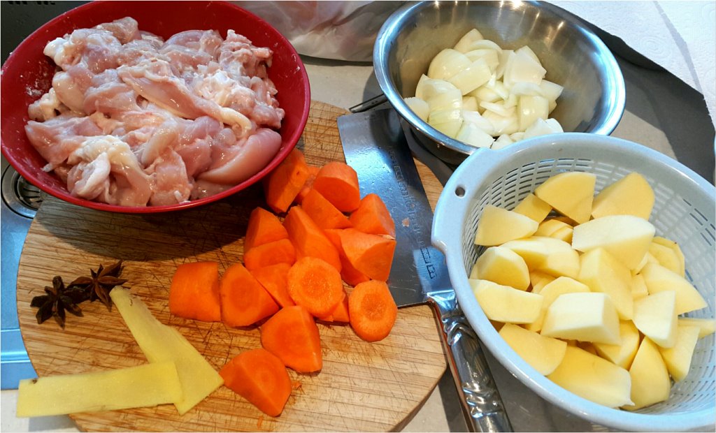 材料,雞上肶起肉,留中間條骨,洋蔥切角,薯仔1個切片,其它切角,甘筍切角,2粒蒜頭