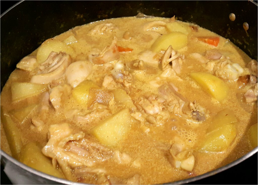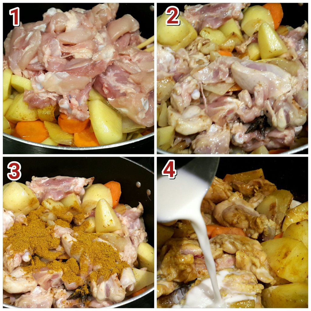 - 加入調味料(生抽2茶匙,雞粉2湯匙 , 咖哩粉2湯匙 , 椰汁300毫升 , 鹽少許 , 糖少許 , 八角2粒)炒勻