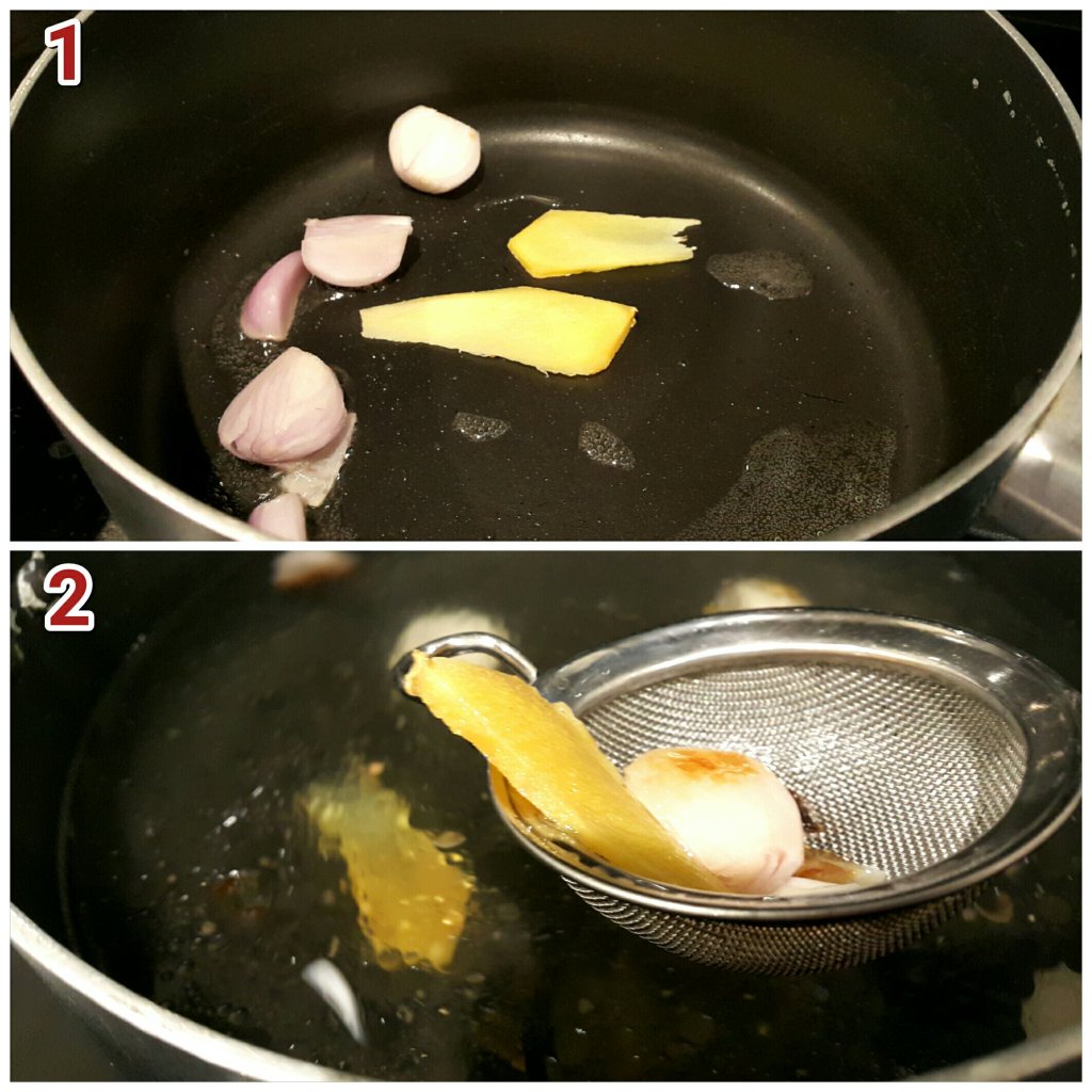- 用中大火燒熱煲底,加入薑片和紅蔥頭煎至金黃色