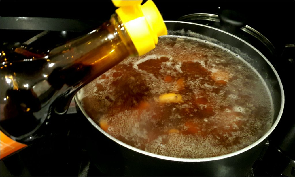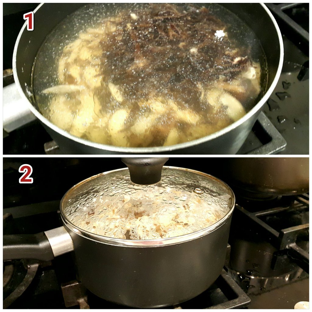 - 加入1.5公升水,夾起薑片和紅蔥頭