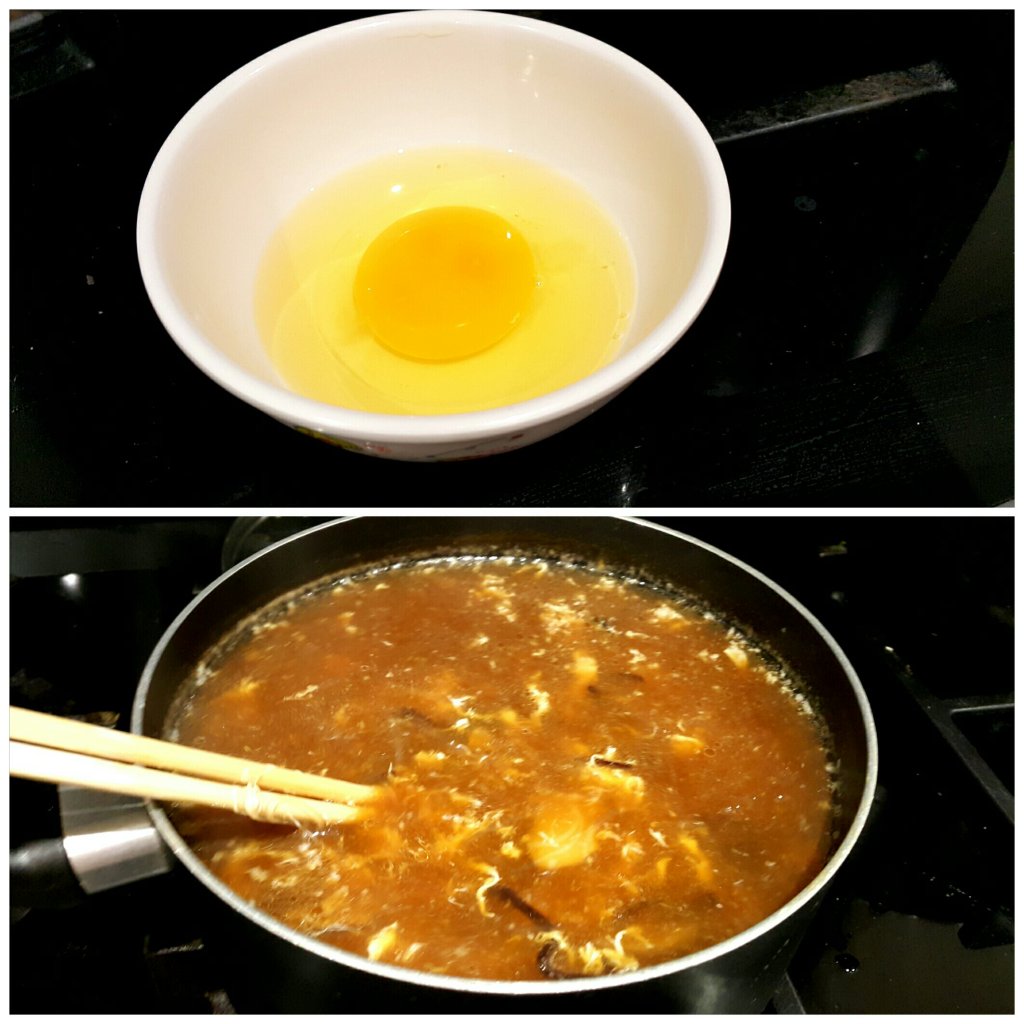 打散1隻雞蛋,保持細火,逐少搗入蛋漿,用快子打轉,攪出蛋花