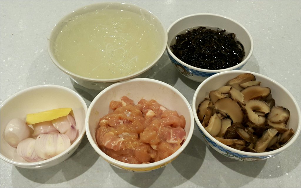 材料,先將木耳絲和粉絲用清水浸1小時,木耳絲中途換水兩次(用手榨乾污水出來,再換清水浸)