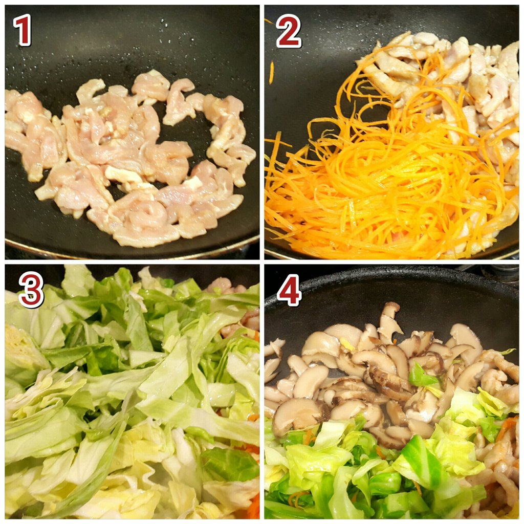 - 加入椰菜絲,灑上少許雞粉,少許鹽,少許糖,略炒一會至軟身