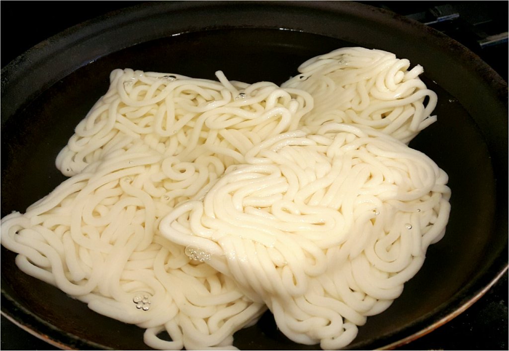 先用滾水,大火滾起轉細火煲至烏冬鬆散,過篩隔水備用