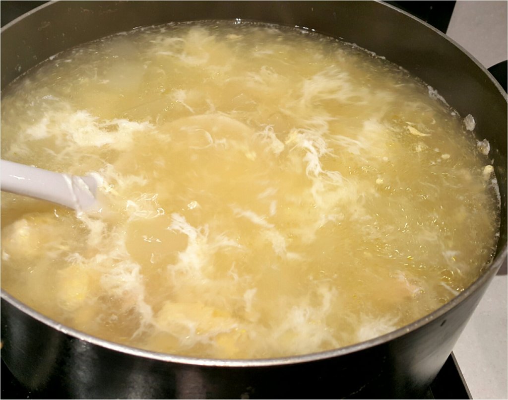 大火後轉細火滾1個鐘後加入咸蛋白,用快子攪成蛋花,加入1至2茶匙鹽調味