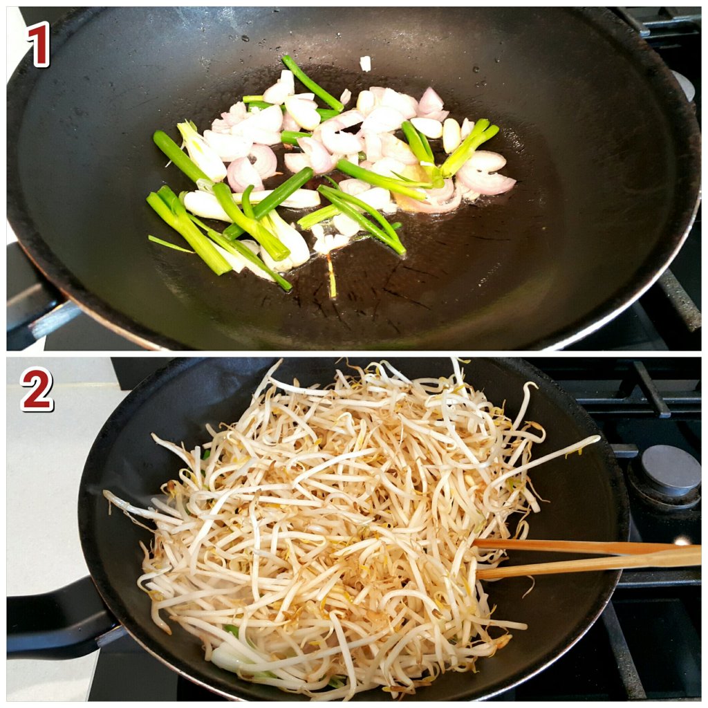 - 加入芽菜,灑少許鹽,少許麻油,少許胡椒粉,炒至微軟身後,全部盛起備用