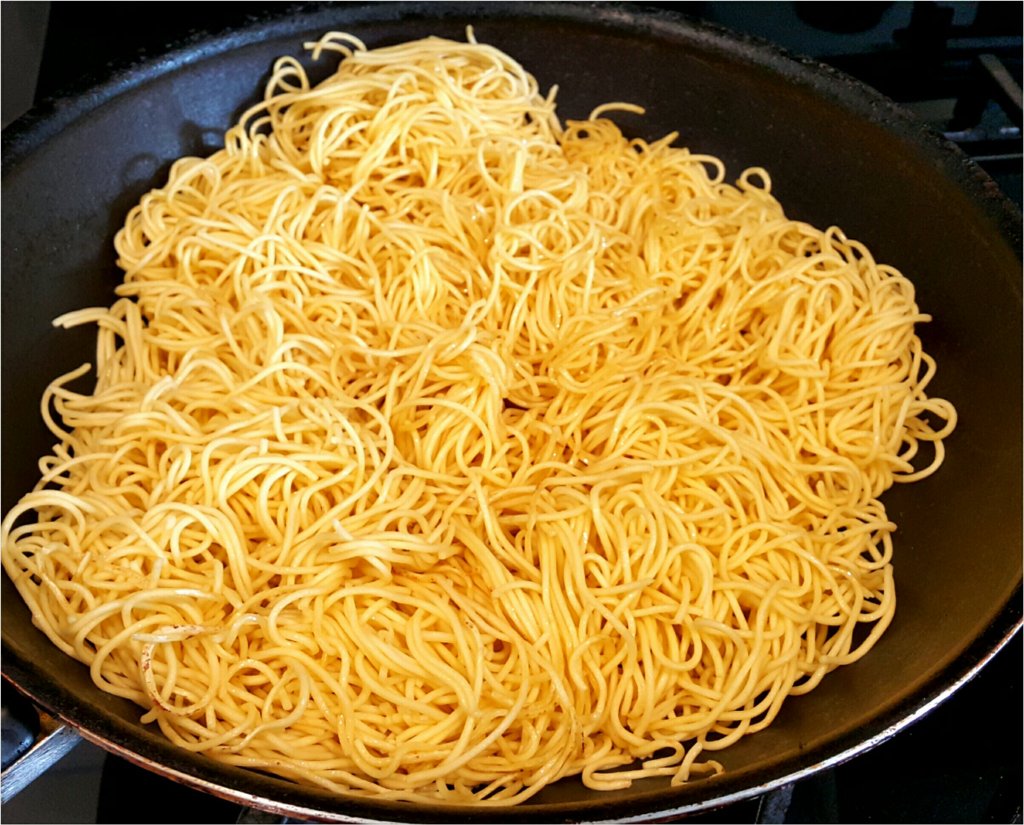 中大火燒熱鑊,加入2湯匙油,加入炒麵,煎底面一會,再炒至略為鬆散