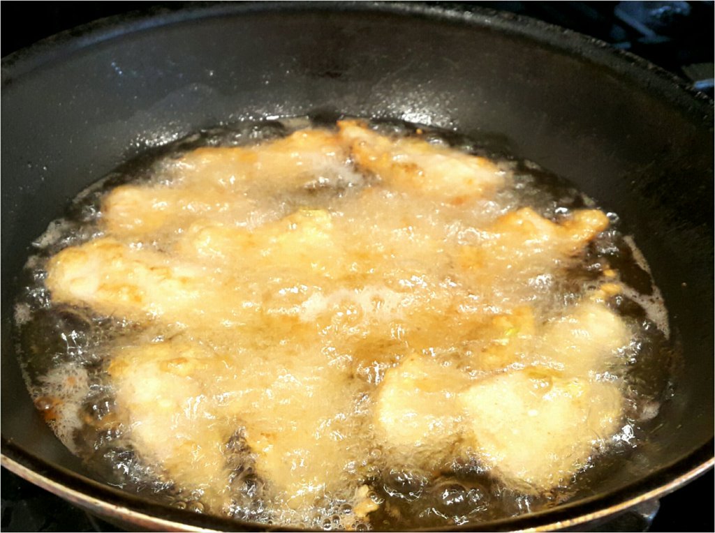 中細火炸至全塊豬扒金黃色,每邊炸大約3分鐘,觀察顏色