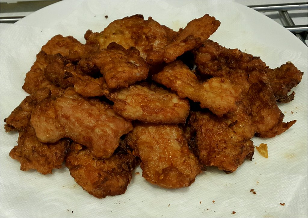 | 先豬扒一塊切開3件,切口斜切,用2湯匙梳打粉加水,水過肉面,如果天氣熱放雪櫃中等1小時,之後換清水,等多1小時 , 再換清水 , 等多1小時後用篩輕力壓去多餘水份 ,再用廚紙略為印乾些 , 最後醃6小時或一晚備用 |