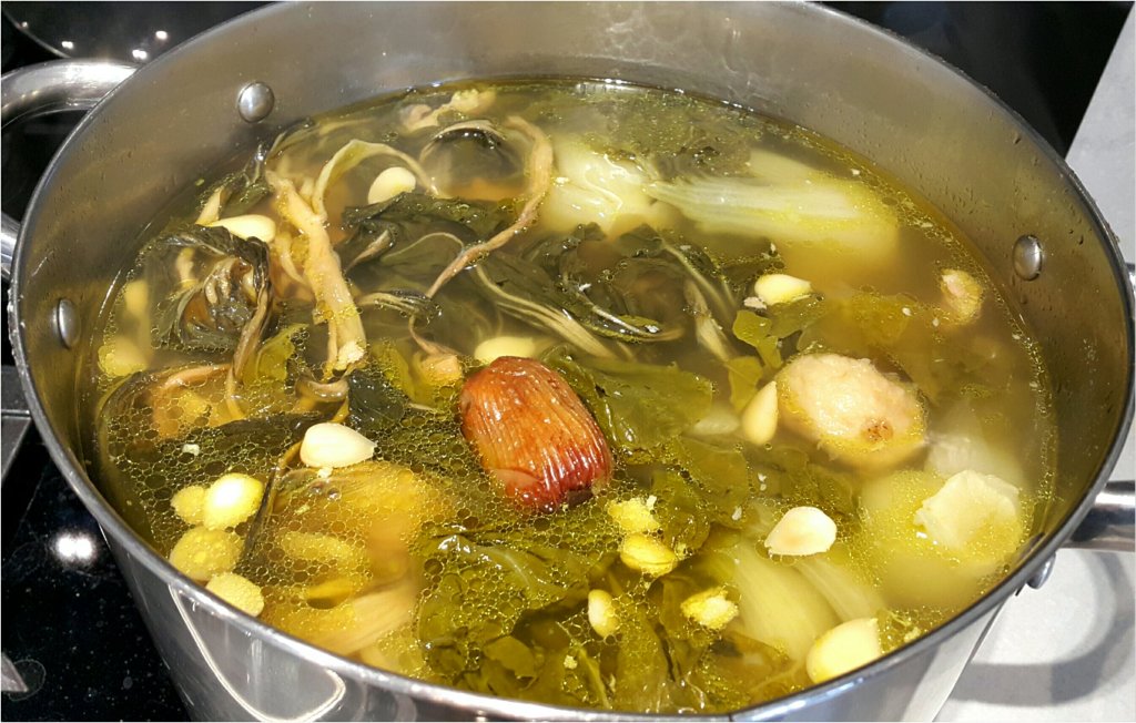 加入冷水3至4公升(加水到接近煲頂),蓋住大火煲滾後轉細火2.5小時