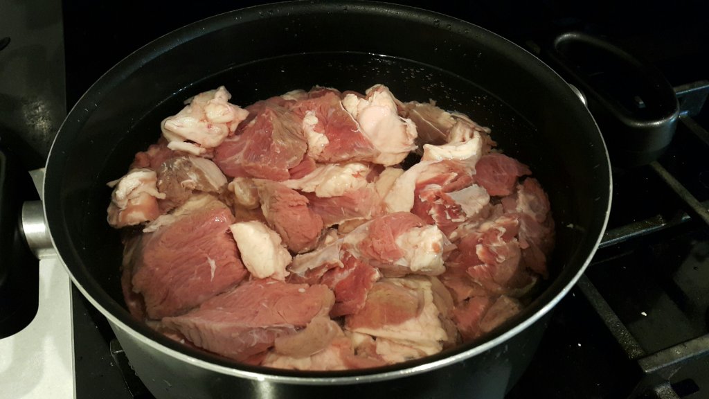 牛朒切厚片後,放入湯煲,加入2片薑,少許酒,再加入冷水至蓋過牛朒,大火煲滾後,過篩隔水備用