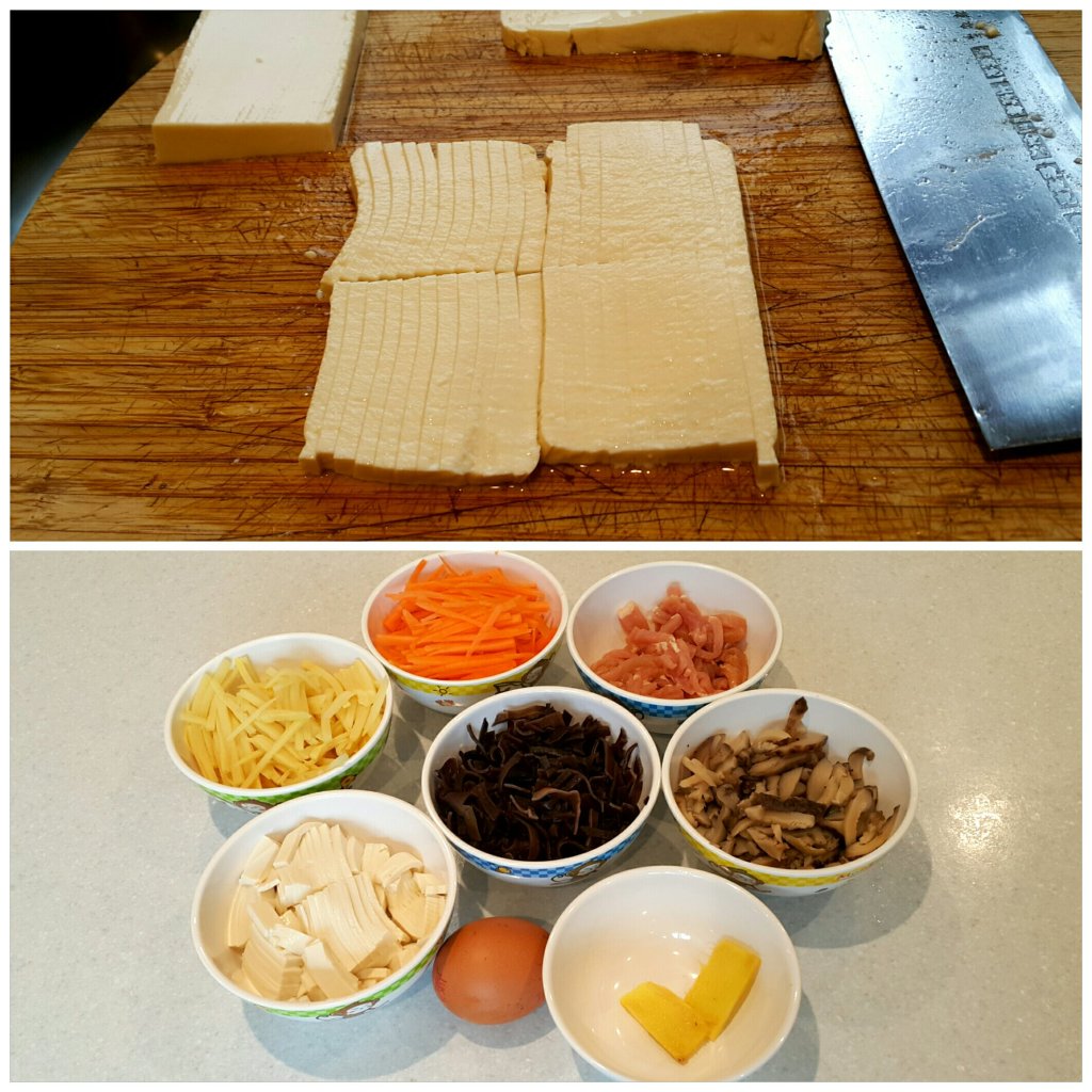 材料 , 豆腐橫切兩次,再直切幼條狀,全部材料切絲