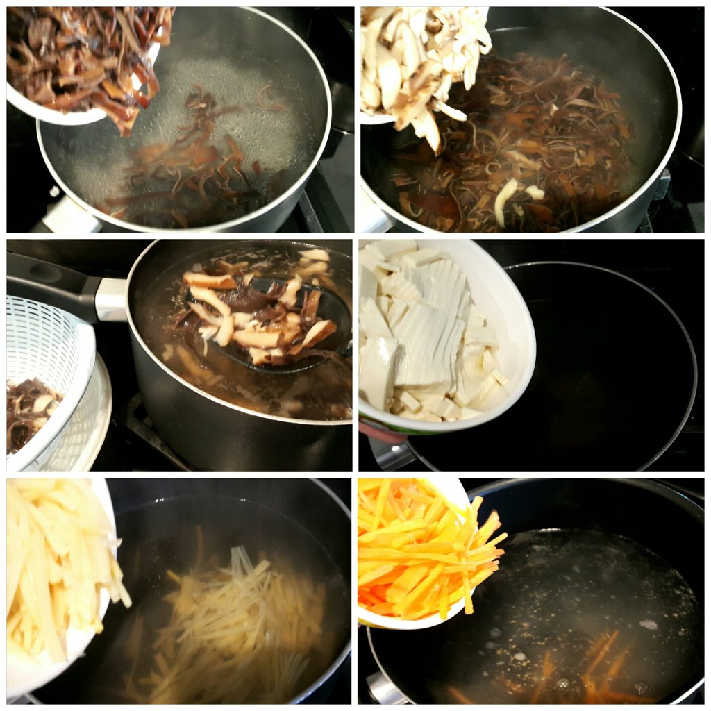 半煲滾水,逐樣已切絲材料用滾水煲2分鐘,盛起備用,除了豬肉絲