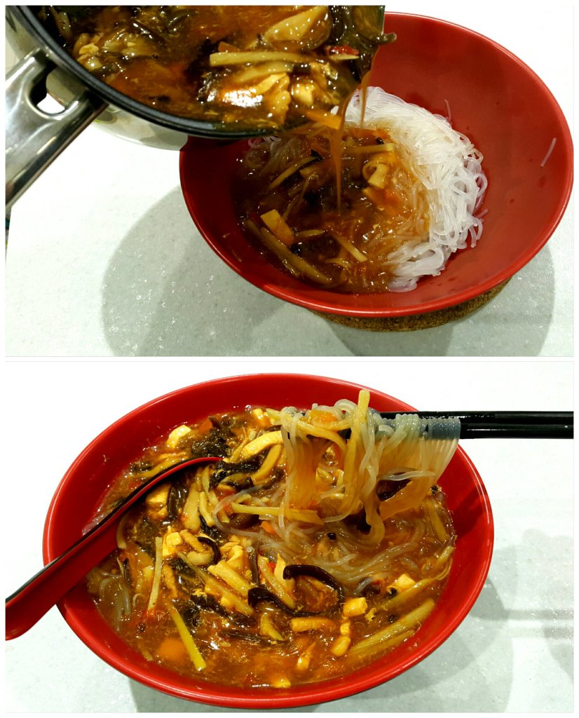 細湯煲加入一大湯碗滾水,加入2茶匙雞粉,半茶匙鹽,半茶匙糖,少許麻油,加入一個粉絲,煮至全熟,夠軟身後,放入湯碗中,加入已翻熱酸辣湯至湯碗8成滿,便完成一碗“酸辣湯粉絲”,在上海菜館食的差不多味道,你們都不妨一試~
