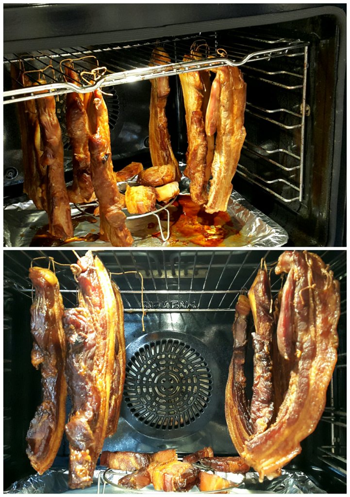 預熱15分鐘焗爐,76度,掛上焗爐架,過長剪短,餘下放上蒸架上,放入已鋪好錫紙的焗盤在焗爐底部,已防汁液滴下,焗12小時便完成