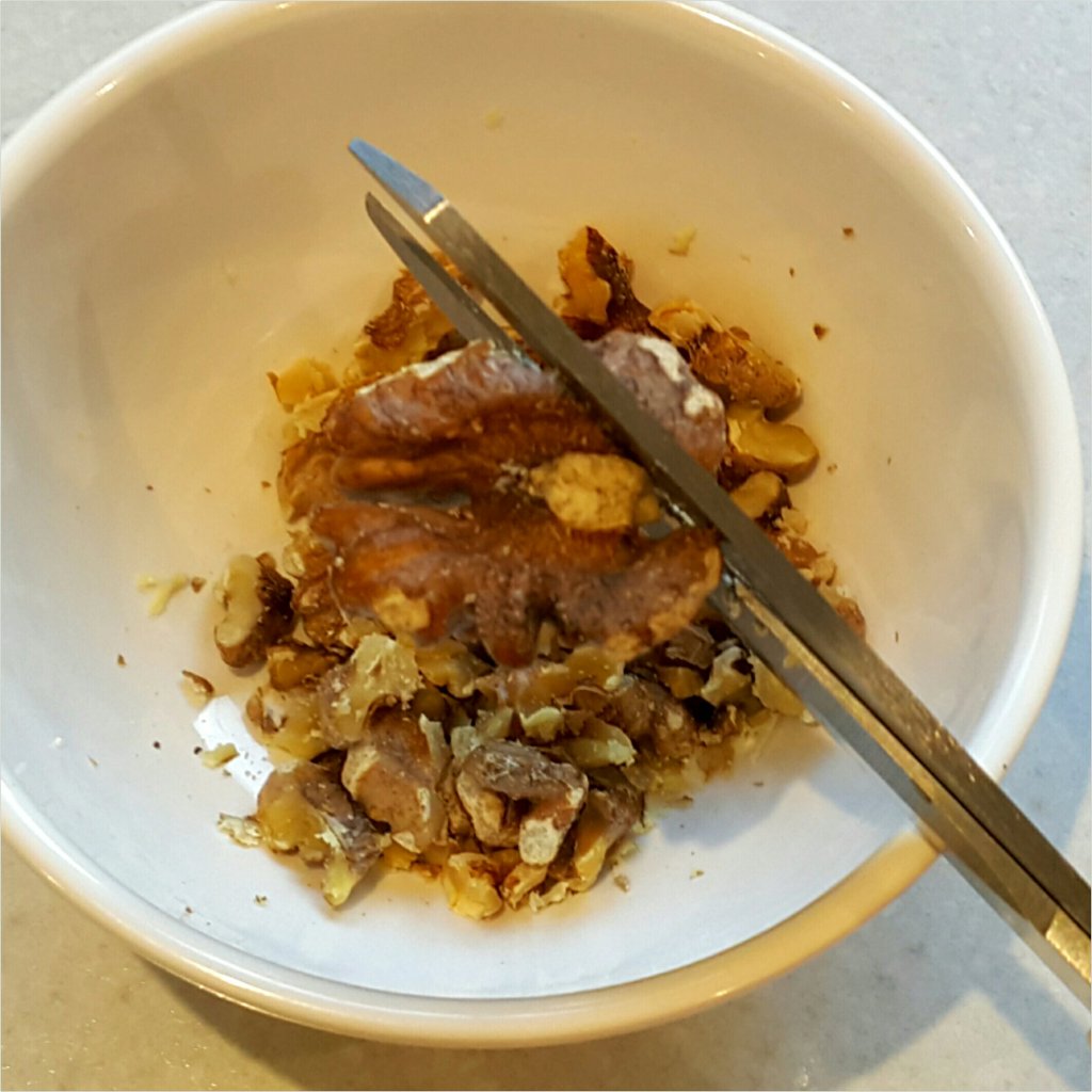 核桃,如果未熟,先180度焗8-10分鐘,如果已金黃和有香味已完成,量好1細碗份量,用廚剪,剪細粒備用
