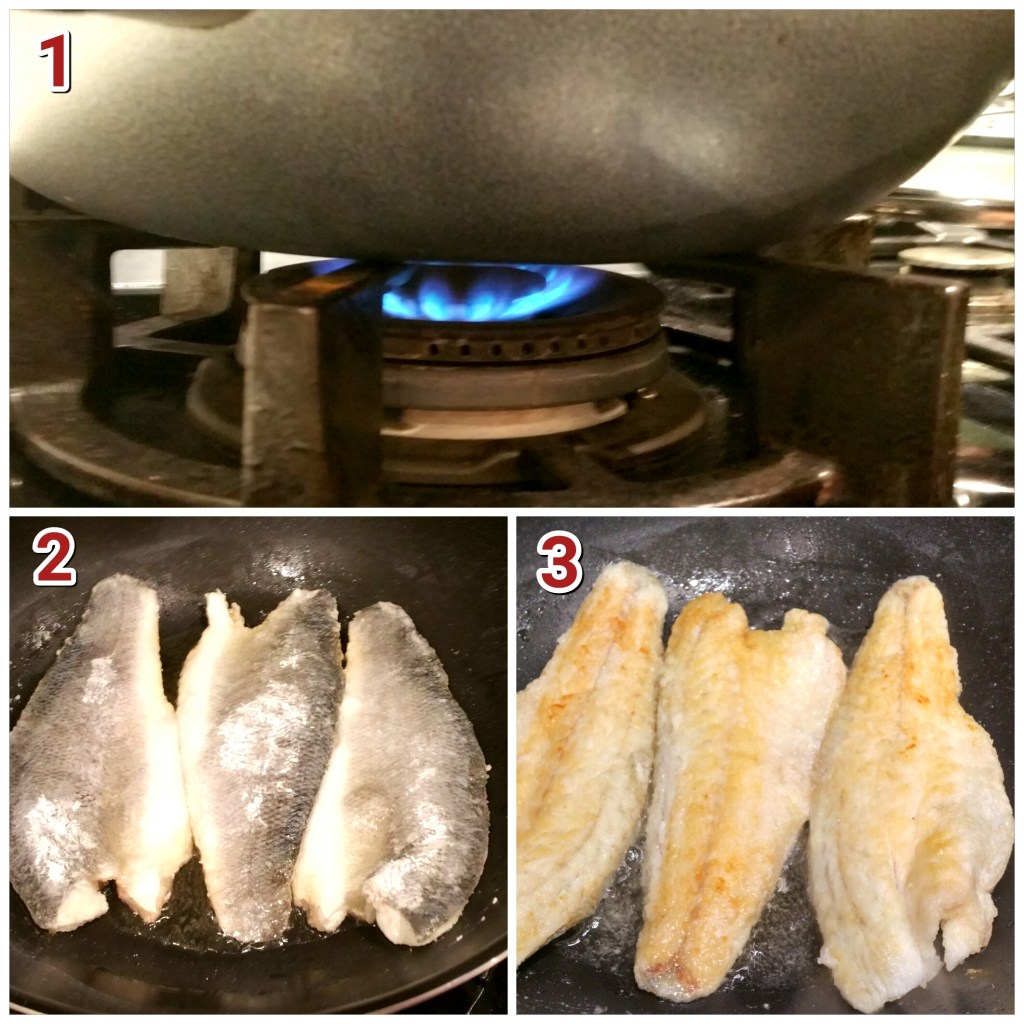 - 煎魚皮那邊,大約3至5分鐘,從覆做法,用鑊剷小心剷起打側檢查,夠金黃色便完成